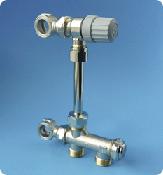 Bottom-connected two-pipe valve with connection to the floor. The valve is reversible with the thermostat on the right or left. The capacity is presettable between Kv values 0.04 and 0.60. The delivery setting is 0.60 m3/h at 1 bar. The flow direction is fixed with the inlet furthest from the thermostat, as indicated by the flow arrows on the valve body.